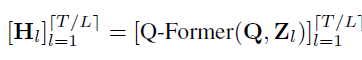 합쳐진 인코더 출력을 LLM에 입력하기 위한 토큰으로 변환하기 위해 Q-Former를 활용한다. Q-Former는 이미지 인코딩에서 텍스트와 관련된 정보를 추출하고 LLM에 의해 해석 가능하도록 훈련된다. 2