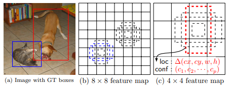 default box에서는 박스의 위치(offset)와 각 클래스에 대한 신뢰도를 예측합니다. 위치는 이전의 다른 모델과 동일하게 (x, y, w, h)로 default box마다 예측을 수행하게 되고, 클래스 + 1(배경) 까지 신뢰도 점수를 계산합니다.