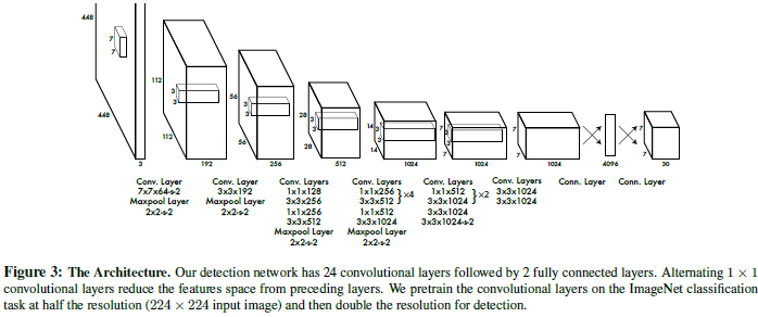 YOLO v1에서는 다른 CNN 구조를 쓴 것이 아니라, DarkNet이라는 별도의 네트워크를 제안합니다. 논문에 따르면, GoogLeNet 모델에서 영감을 받아 설계했다고 합니다. 24개의 conv 층, 2개의 fully-connected 층으로 연결하고, GoogLeNet의 inception 모듈 대신에 1x1 reduction 층을 사용합니다. 또한, OD는 fine-grained 문제이기 때문에 이를 효과적으로 수행하기 위해 2배 해상도로 높여 진행한다고 설명하고 있습니다.