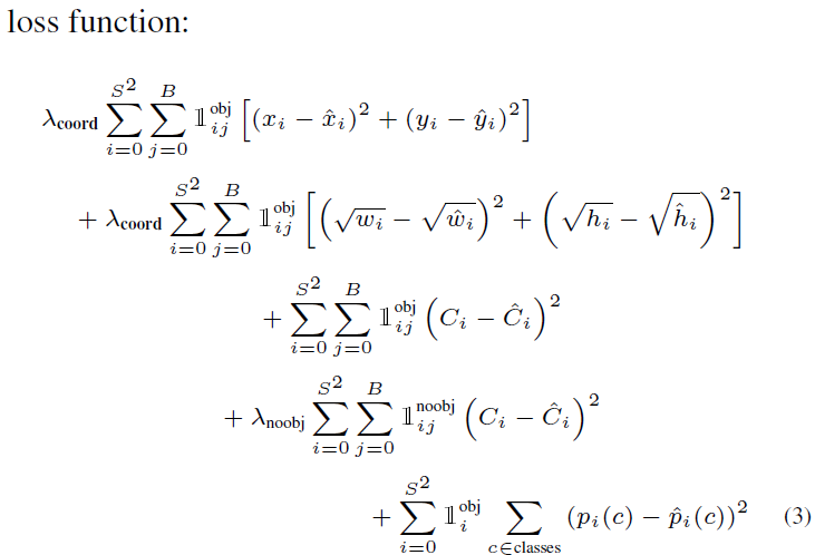 손실함수 역시 YOLO의 철학을 반영하듯이 여러가지 손실함수를 합한 형태로 구성된 것으로 보입니다. 아래 이미지의 첫 두 항은 Localization(중심점 손실 + w & h 손실), 중간의 두 항은 Confidence score (객체가 있는 경우 + 객체가 없는 경우), 마지막은 분류 문제에 대한 손실입니다.