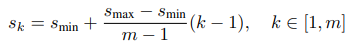 또한, Faster R-CNN에서 사용된 anchor box와 같은 default box를 이용합니다. 서로 다른 스케일과 가로세로비를 가진 박스를 사용했다는 점에서 anchor box와 유사하지만, SSD에서는 앞서 언급한 Multi-scale feature maps에 적용합니다. default box의 스케일은 아래 공식에 따라 결정되며, 가로세로비율은 {3,2,1, 1/2, 1/3}에 따라 곱한 값으로 결정됩니다.