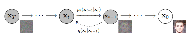 가우시안 노이즈인 T에서 점진적으로 노이즈를 제거하면서 원본 데이터 분포의 샘플을 생성하는 것을 목표로 합니다. 현재 상태와 타임스텝을 신경망에 입력해 계산된 노이즈 예측값을 제거하는 과정을 거칩니다.