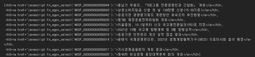 # 보도자료 페이지별 웹사이트 요청해서 태그를 찾고, 그것을 리스트에 연장하기