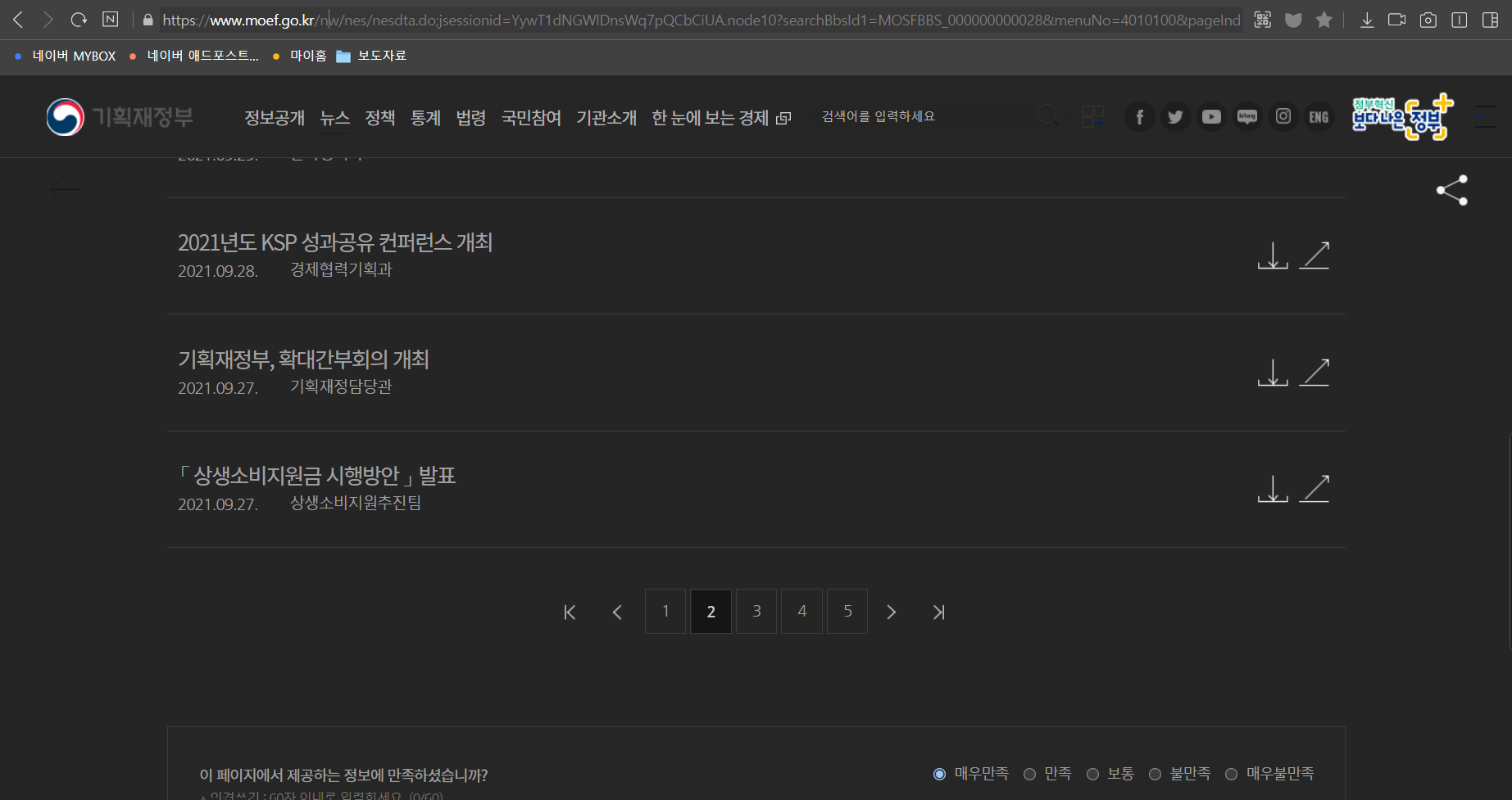 이전에 봤던 기획재정부 보도자료 홈페이지를 들어가보자. 가장 아래로 가보면 "1 2 3 4 5" 상자로 이뤄진 페이지로 갈 수 있는 박스가 있는 것을 확인할 수 있다. 이 상자들을 눌러보자. 그리고 그 URL을 한번 확인해보자.